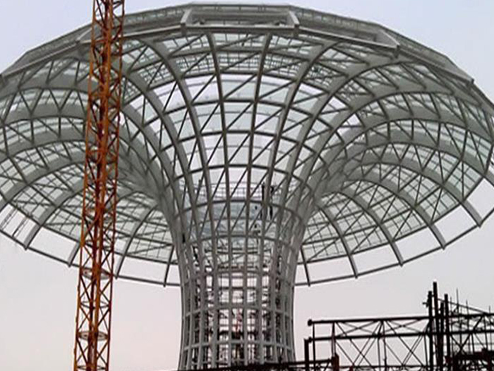 二、球形网架结构因其结构新颖,受力合理,自重轻、用钢量低等优点。如大型体育场馆球形平湖螺栓球网架、公共场馆球形网架、电厂平湖螺栓球网架、水泥工业球形网架、仓储物流球形网架、平湖干煤棚工业球形网架、平湖收费站平湖加油站球形网架、展览中心、影剧院、商场、航站楼、候车厅、工厂平湖车间、仓库、电视塔等球形螺栓球节点网架。国内球形网架结构主要分为:平湖焊接球节点网架及螺栓球节点网架两种。螺栓球节点网架其构件工厂内加工量较大,现场安装便捷,适用于现场工期紧,平湖施工条件、用电量受制约,网架形状复杂、平湖杆件定位困难的异形结构。螺栓球节点球形网架系统基本由平湖杆件、螺栓球、支撑支座等组成。按照节点形式可分为交叉平湖桁架体系、四角锥体系、三角锥体系等。支撑方式多为固定支座支撑。对于大面积、大跨度及有特殊受力或伸缩要求的网架结构可采用橡胶支座、滑移支座、球铰支座等支撑形式,以满足结构自身的受力稳定、均衡,便于内力释放等设计要求。